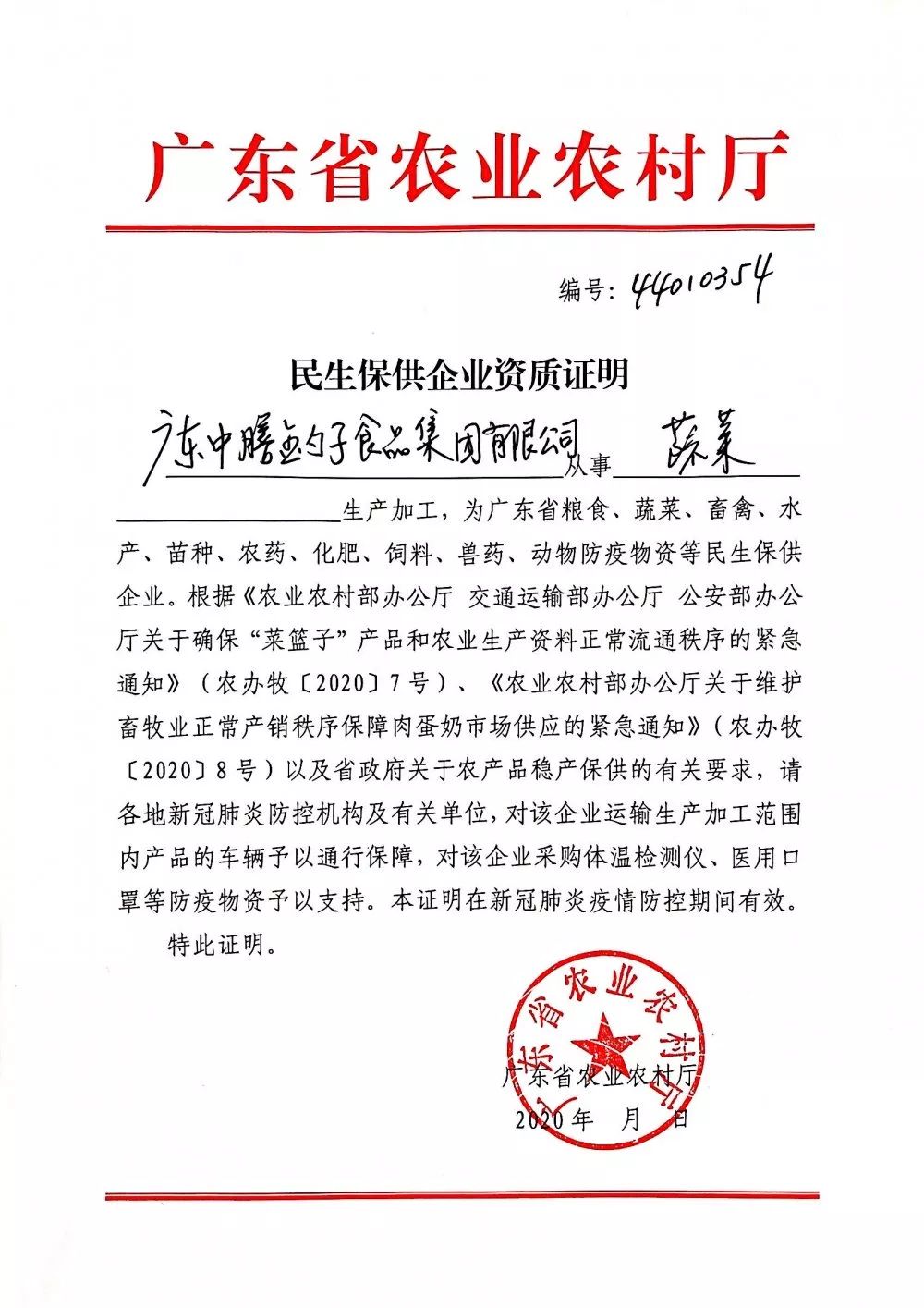 美彩国际 疫情期间,为落实民生保障工作,多地政府部门在行动。省农业农村厅为保障特殊时期农产品及农业生产资料有序流通,保证农产品有效供给,为农产品和农业生产资料加工企业,开具优先“绿色通道”证明!率先获得民生保供企业资质证明近日,中膳金勺子食品集团率先获得省农业农村厅开具的“民生保供企业资质证明”。证明显示:广